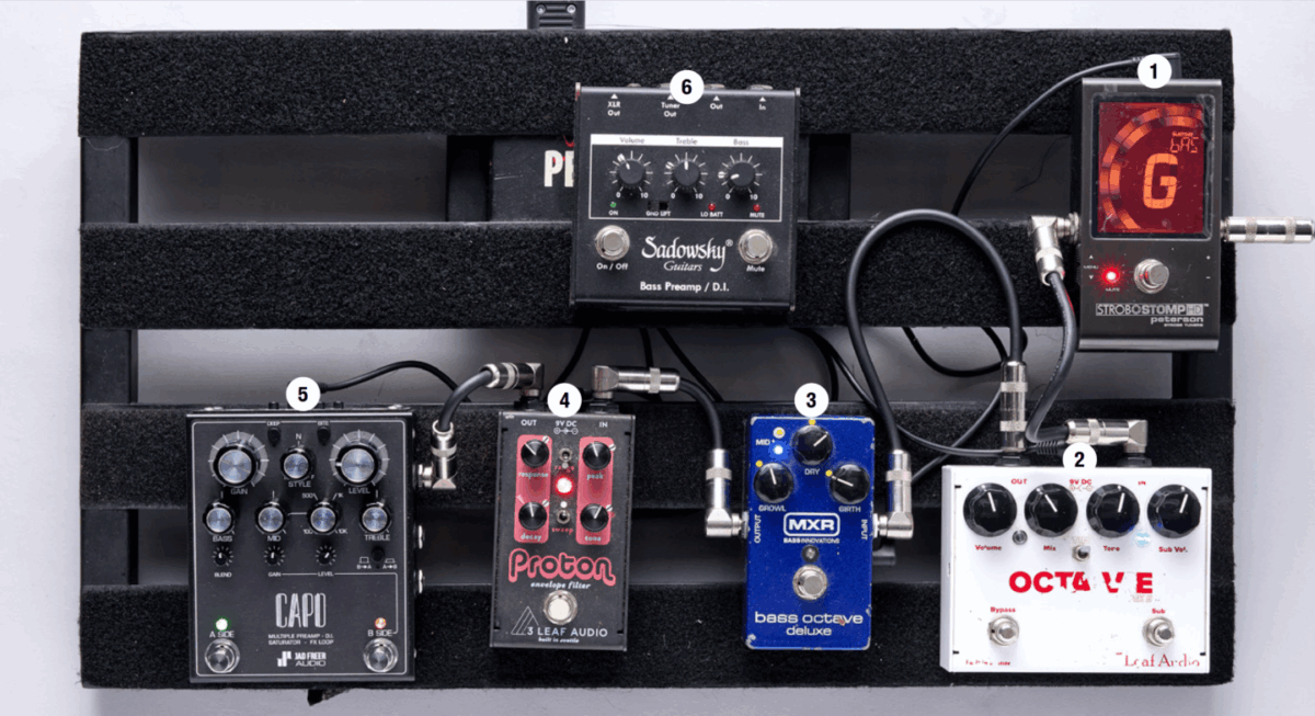 “写真にはないですが、オクターバーはボスのOC-5も使っていて、ティム・ルフェーヴルのシグネイチャー・モデルの②は原音も鳴らしつつシンベみたいな音、OC-5は原音をカットしてローランドのTR-808みたいなイメージ、“MIDブースト”がついている③は抜けが良く使えるオクターバーとして使っています。⑤は、僕けっこう古いアンプとかがヘタッて「勝手に歪んじゃう」みたいな音が好きで。その感じをエフェクターで再現できるのが気に入っています。音が太くて、軽いタッチでもサステインが伸びてラクに弾ける感じ。⑥はパッシヴのジャズベをアクティヴっぽいサウンドで使いたいときに使っています。その日その時で使いたいエフェクターがコロコロ変わるので決まったボードは組んでないです”。