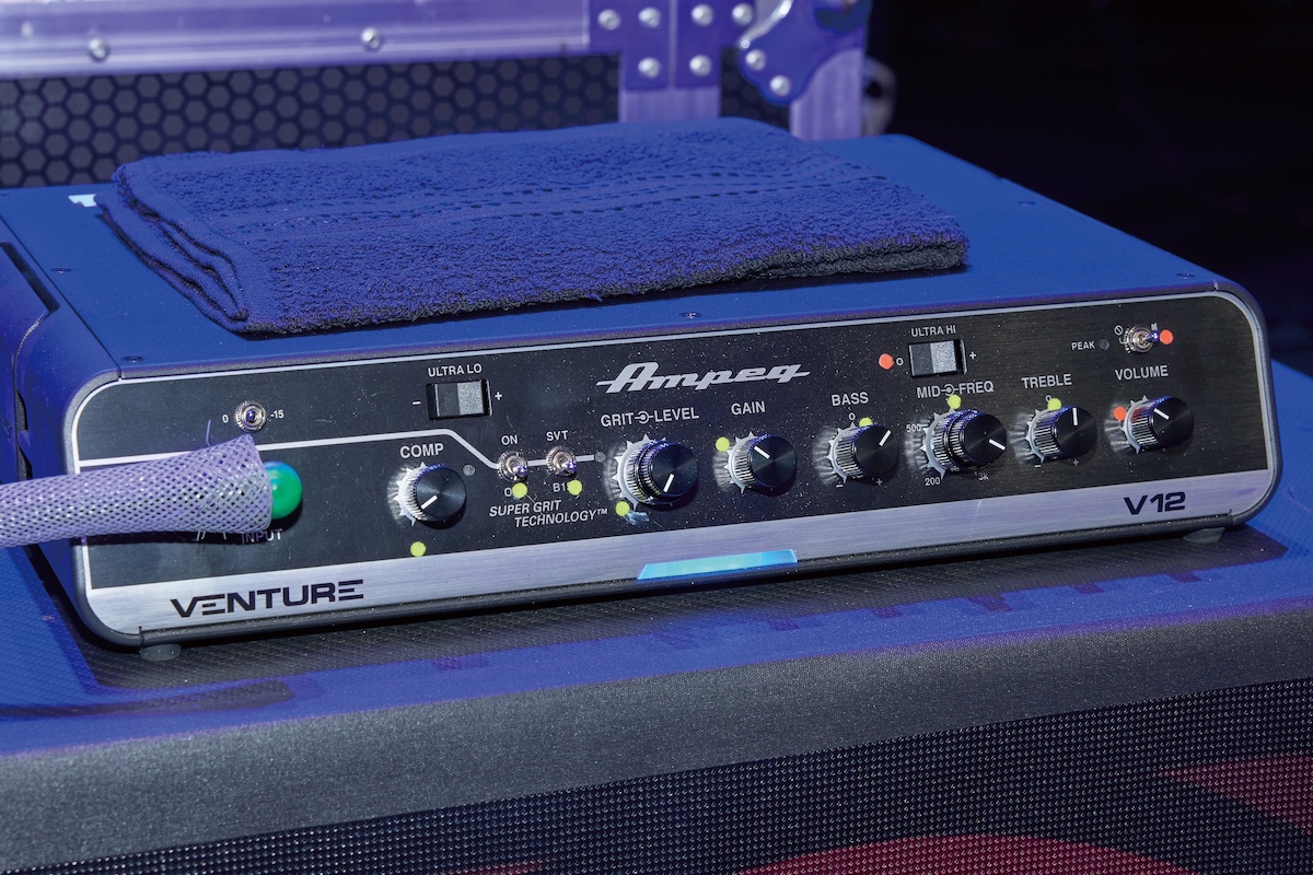 アンプ・セットにはアンペグ製を採用。アンプ・ヘッドは、コンテンポラリーなサウンドとClass-D回路による軽量設計が人気を集める、2023年登場の新モデル、Venture V12。キャビネットにはBEATのエレファント・ロゴがあしらわれていた。チャップマン・スティック、2本のエレキ・ベース、シンセサイザーの信号はいずれもNeural DSP製Quad Cortexを経由し、Venture V12とPA卓へ送られていた。