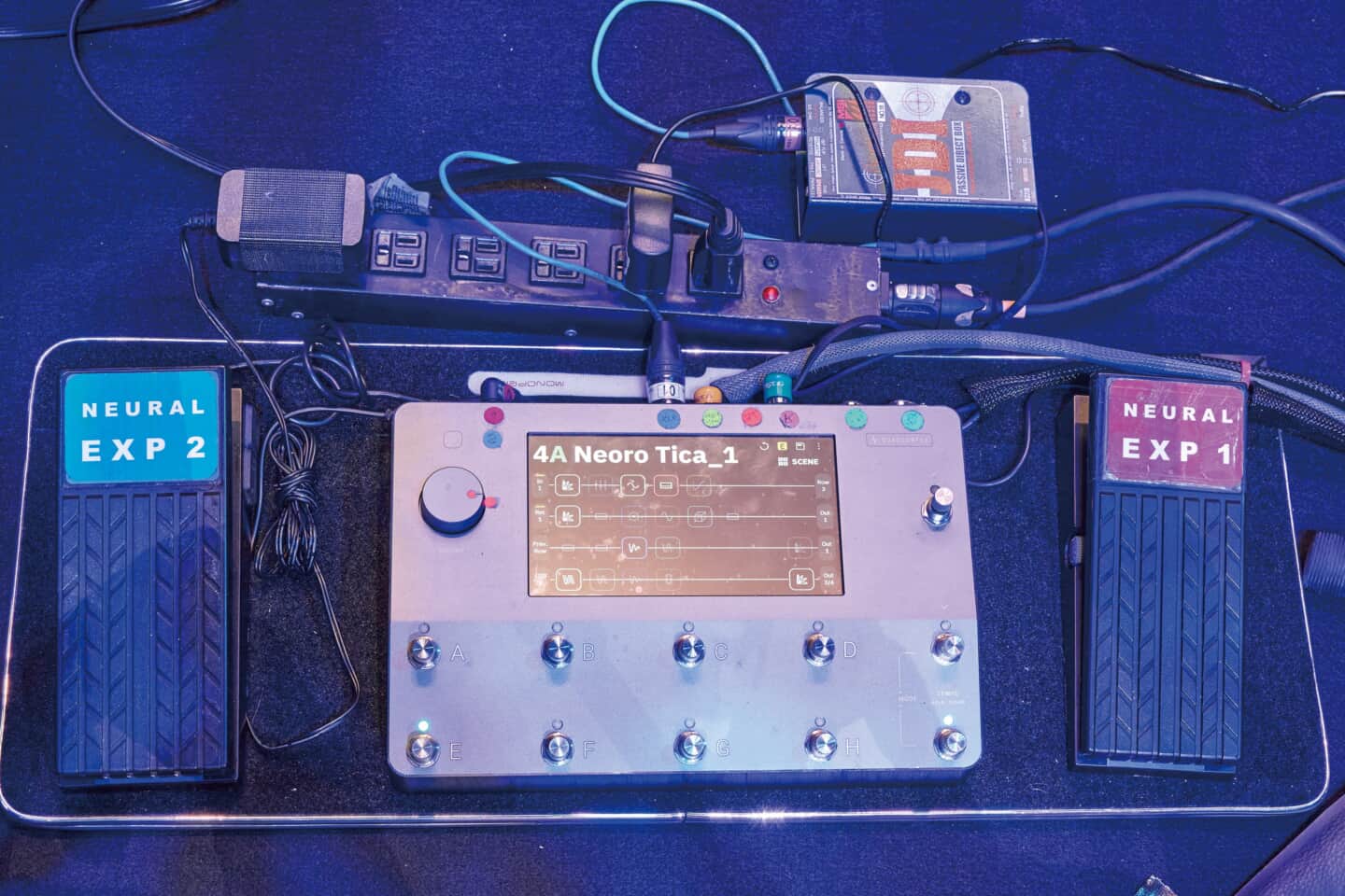 足下には、1年ほど前から導入しているというNeural DSP製Quad Cortexをセット。1曲ごとにディレイ、オーバードライブ、コンプレッサーなどの各パラメーターを調整し、トニー自ら全曲分のプリセットを組んでいる。接続されたふたつのエクスプレッション・ペダルは、おもにヴォリュームとディレイの操作で使用される。DIには、発売当初からのお気に入りだというラジアル製JDIを採用。レコーディングでも使用しているそうだ。