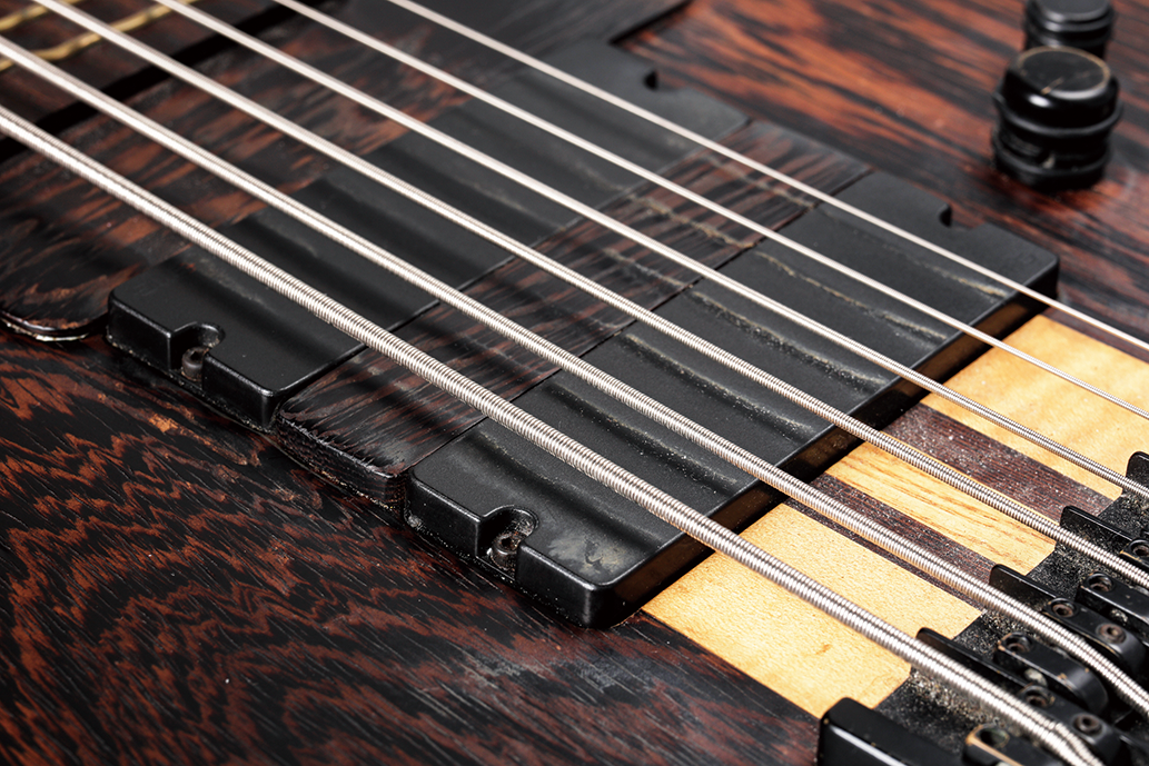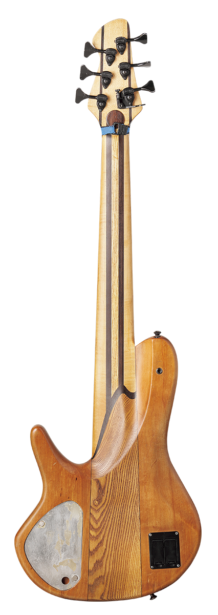 もともと僕は、スラップと指弾きと両方に対応できる楽器が欲しかった。メイプル指板の楽器はスラップには良くても指弾きだとイマイチだけれど、このベースは指弾きに寄せた楽器でありながら、スラップでもかなり良い感じで使えるんだ。あと、僕は手が小さめだから、6弦でコードが弾きやすいように、スケールは少し短めの33インチになっている。 ピックアップはEMGで、シングルコイルとハムバッキングの音量が揃うようにできると言われたけれど、ソロでブリッジ側をハムバッキングにした時のブースト効果が欲しいことがあるから、あえてハムバッキングで音量が上がって音が太くなる状態のままにしてもらっているんだ。