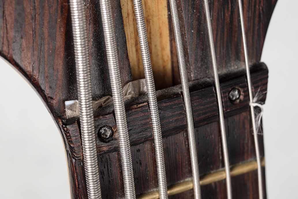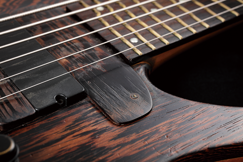 ナット部の破片は、7年前にライヴ会場で不具合があった際に、アンダース・マティソンがCDケースの破片を使って応急修理したのがそのままになっているという。ちなみに愛用の弦はDRのDragon Skin+ Quantum Nickel。.032-.135ゲージのセットだ。
