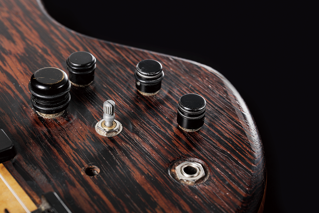 コントロールは奥の小型ノブが左からベース、トレブル、追加したミドル。手前のノブは左からフロント・ヴォリューム、リア・ヴォリュームで、それぞれプルすることでピックアップがコイル・スプリットされる。手前の穴は元々キル・スイッチが搭載されていた跡だ