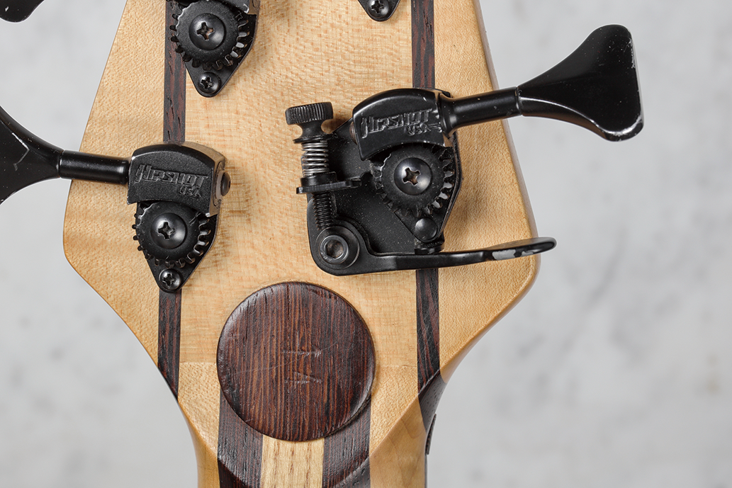 ペグはヒップショットのUltralight 3/8で、6弦にはレバーでチューニングを変化させることができるエクステンダーを装備。円形プレートは共振を抑えるためのものだそう。