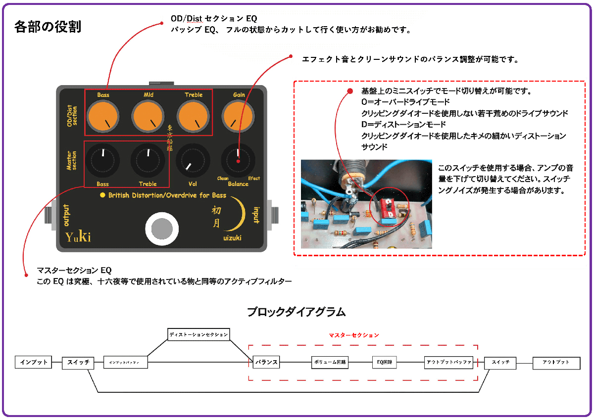初月 -uizuki-は、ブリティッシュ・スタック系のディストーション〜オーバードライブ・サウンドを求めるベーシスト向けのペダル。ディストーションセクション+マスターセクションの2段構成を採用し、幅広い歪みのキャラクターと、柔軟な音作りを可能にしている。