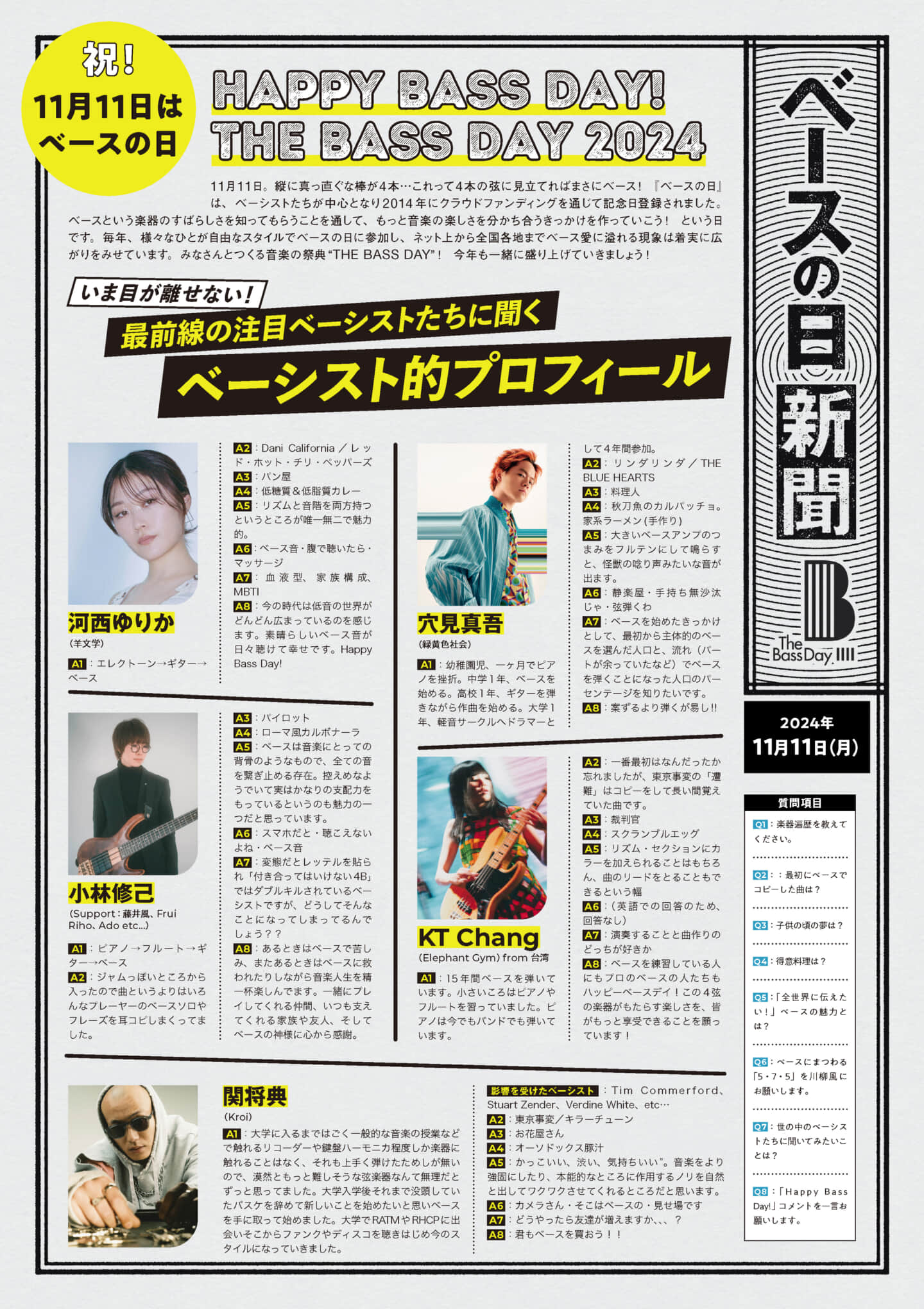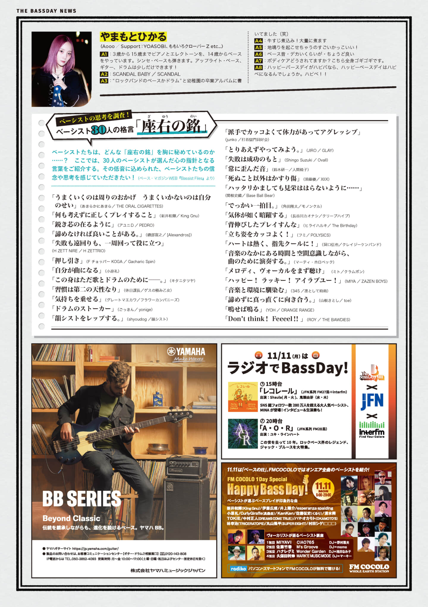 「いま目が離せない!“最前線の注目ベーシストたちに聞く”ベーシスト的プロフィール」と題したQ&Aコーナーには、緑黄色社会の穴見真吾、羊文学の河西ゆりか、台湾のElephant GymからKT Chang、藤井風やAdoのサポートで活躍する小林修己、Kroiの関将典、さらにAoooのやまもとひかるといった注目のベーシストたちが登場。各ベーシストが「最初にベースでコピーした曲」や「ベースにまつわる“5・7・5”」、「世の中のベーシストたちに聞いてみたいこと」などのベースに関する8つの質問に回答している。そのほか、ベーシスト30名の「座右の銘」も紹介されている今年の『ベースの日新聞』はこちらのページからダウンロードすることが可能だ。