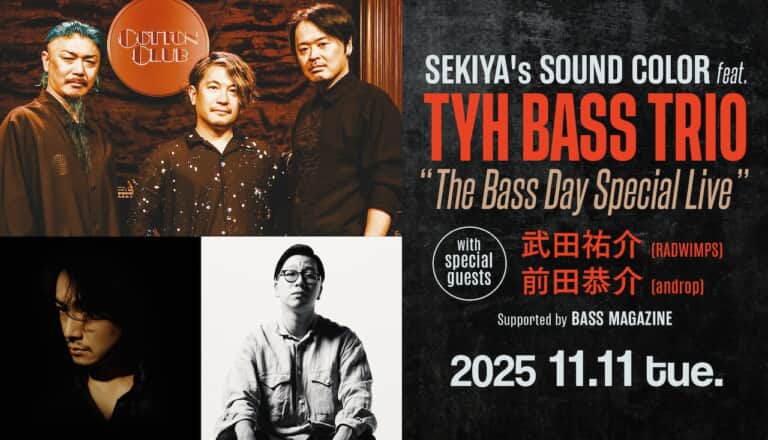 ベースの日を祝う特別セッション、11月11日に東京・コットンクラブで開催! “11月11日=ベースの日”を記念し、今年も豪華ベーシストたちによる特別な一夜が実現する。 東京・コットンクラブでのスペシャル・ライヴには、関谷 … 続きを読む “ベースの日”にTYH BASS TRIOがコットンクラブに登場。武田祐介(RADWIMPS)、前田恭介(androp)がゲストで参加!