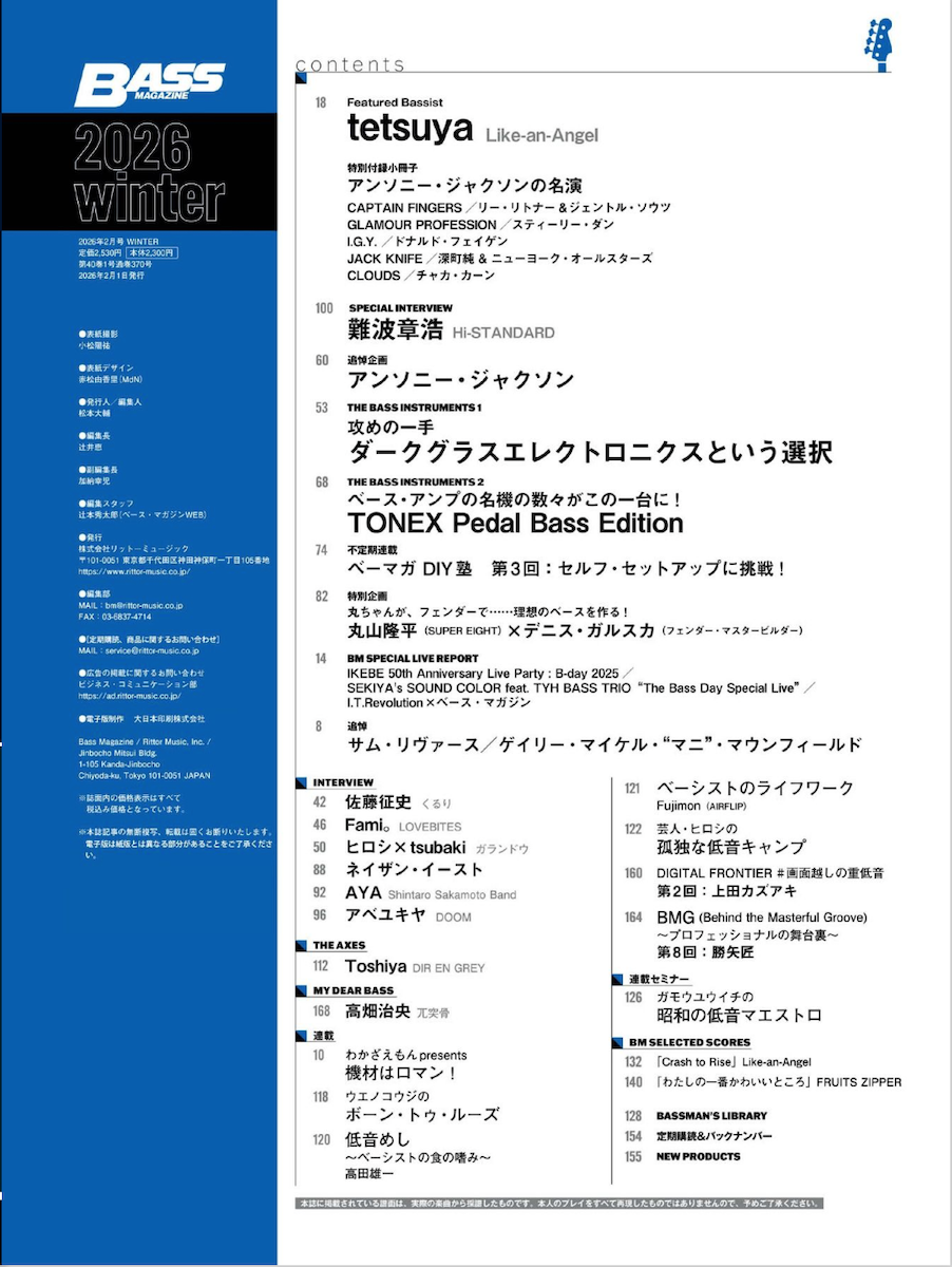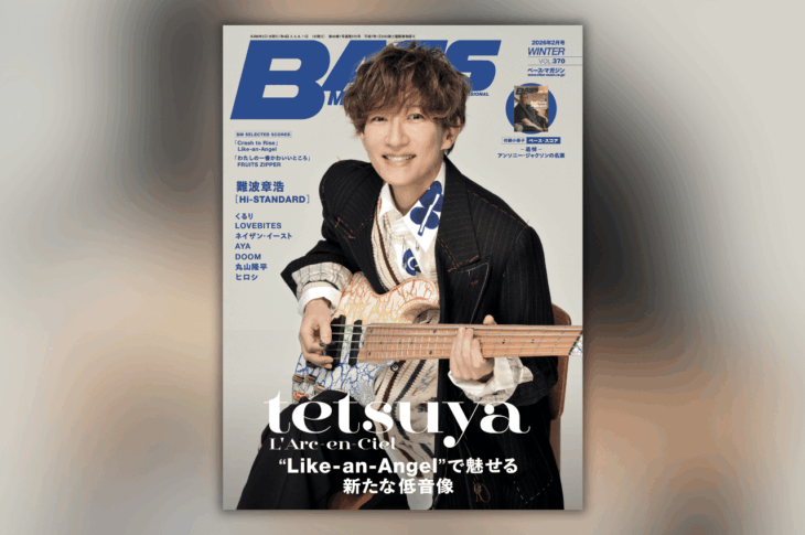 2026年1月19日(月)に『ベース・マガジン2026年2月号(Winter)』が発売された。表紙を飾るのは、L’Arc-en-Cielのtetsuya。本誌表紙への登場は約14年ぶりとなり、2023年春に始動したプロジェクトLike-an-Angelでの活動を軸に、現在のベース・アプローチや低音観を掘り下げる。