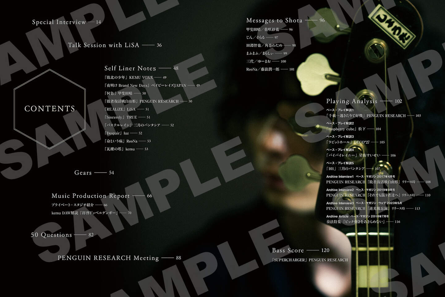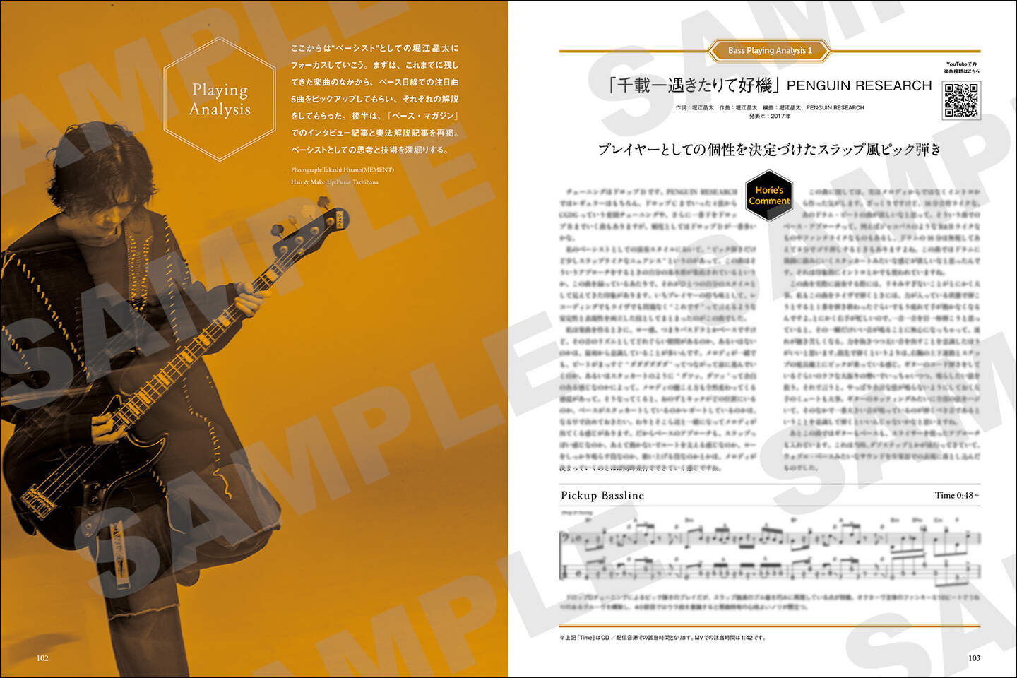 また、マルチ・インストゥルメンタリストである堀江が愛用するベース、ギター、キーボードなどの使用機材や楽曲が生まれる現場であるプライベート・スタジオの紹介記事、『ベース・マガジン』に掲載されたインタビュー記事や奏法解説記事の再掲、PENGUIN RESEARCHの「SUPERCHARGER」のベース・スコアも収録し、クリエイター/プレイヤーとしてのコアな部分もフィーチャー。