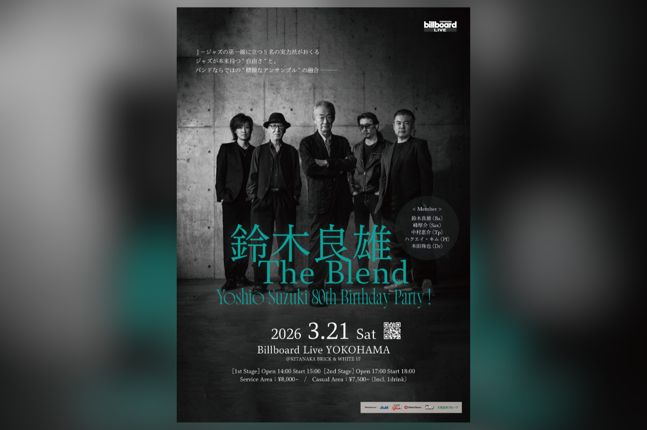 今回のステージは、峰厚介(sax)、中村恵介(tp)、ハクエイ・キム(p)、本田珠也(d)といったJ-ジャズの第一線に立つ5名の実力派とともに、2019年から活動しているThe Blendとしてのもの。The Blendは、2025年6月に2枚目のアルバム『EXPECTATION』を発表し、気迫に溢れ、熱く美麗なジャズを展開している。本公演でも、ジャズが本来持つ“自由さ”と、バンドならではの“精緻なアンサンブル”の融合したサウンドが堪能できるに違いない。80歳を迎えてなお意気軒昂な重鎮ベーシストの姿に刮目してほしい。