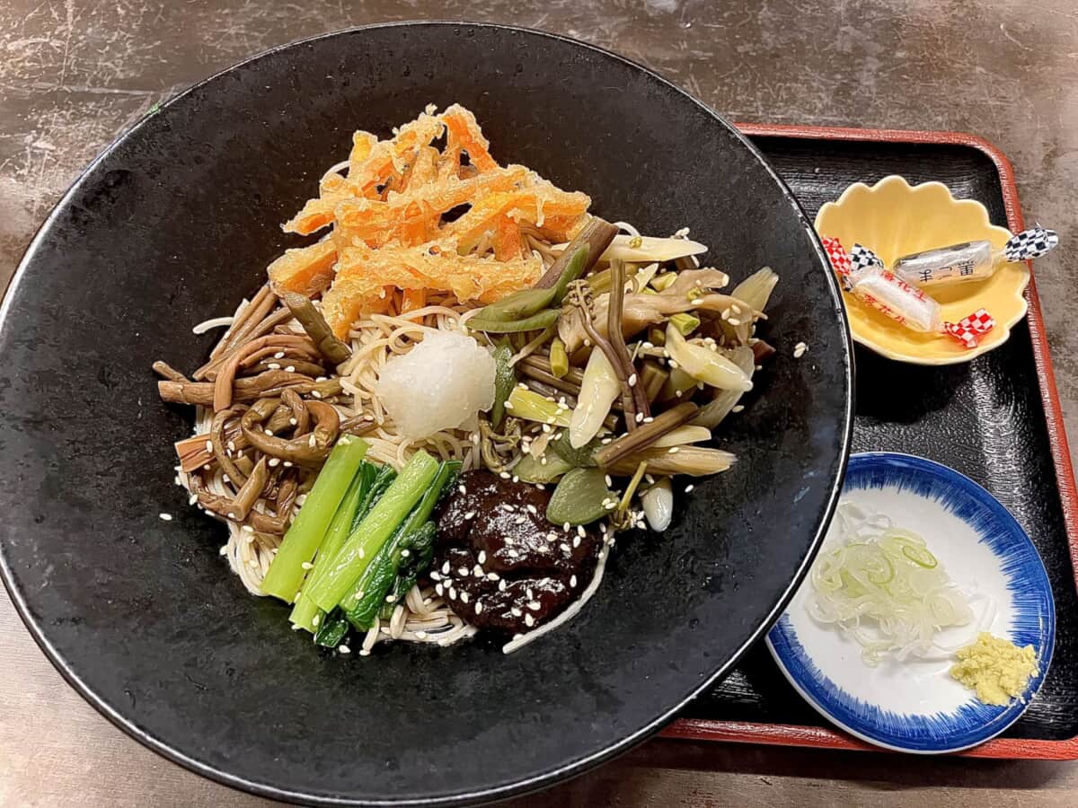 今回行ったのは“深大寺そば ごちそう門前”。20店舗ほどある蕎麦屋のなかでも、僕はここの山菜そばが好きでよく足を運んでいる。
