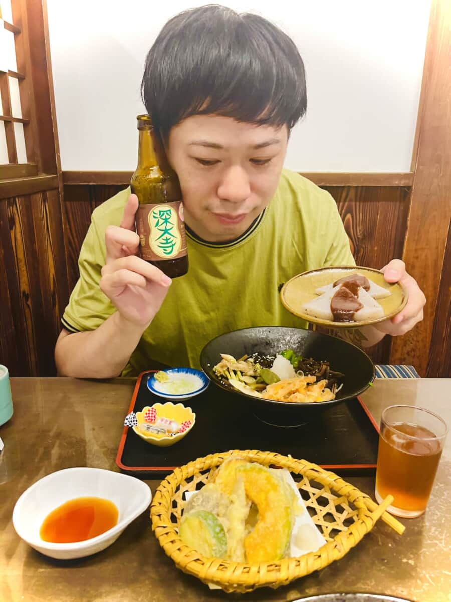 そしてここに来たらもうひとつ外せないのが深大寺ビールだ。蕎麦とビールは喉で味わえ!と言わんばかりの相性の良さ。ブラウマイスターの技が冴えわたる黒ビールは、蕎麦を引き立てるいわばクリーン・ブースターのような存在だ。今回はプラスで野菜天ぷら、味噌田楽を注文。僕の完璧なエフェクター・ボードが完成した。