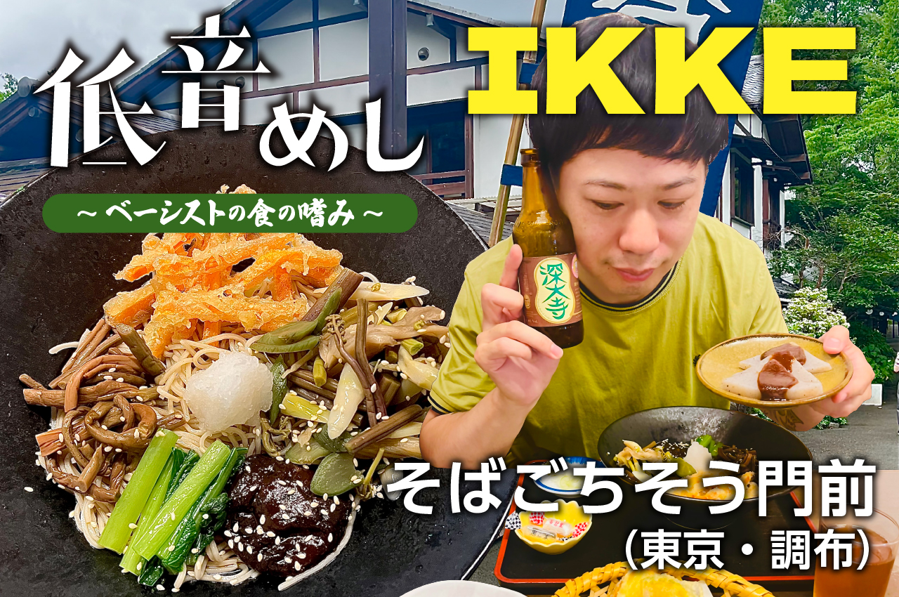 “めし”をテーマに、プロ・ベーシストに音楽活動の活力になるようなお店やお気に入りのメニュー、そのほか“食”にまつわる思い出深いエピソードを語ってもらう連載「低音めし」。第8回目に登場するのは、7弦ベースを操り多数のアーティストのレコーディングやライヴで活躍するIKKE。今日も彼は、東京のパワースポット、深大寺にて、上等な蕎麦をたぐり、コンディションを整えるのであった。(編集部)