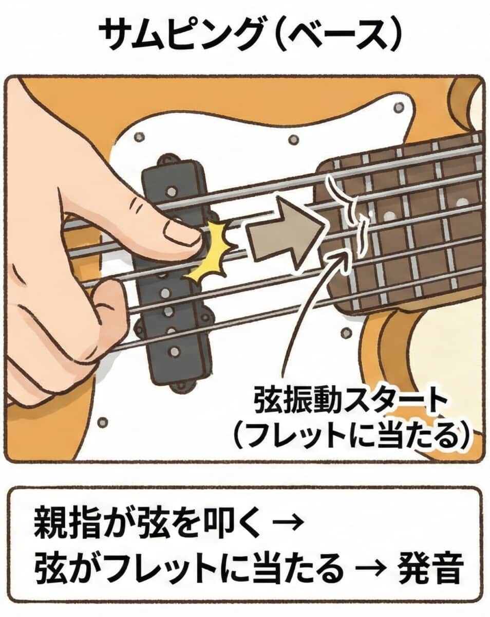 スラップのサムピングは“弦を叩く”という点では、打弦楽器であるピアノの発音メカニズムと似ています。ただ、ピアノはハンマーが弦を叩いて直接弦振動をスタートさせるのに対し、サムピングは親指を弦に素早くぶつけた“結果として”弦がフレットに当たり、そこで弦振動がスタートするという違いがあります。