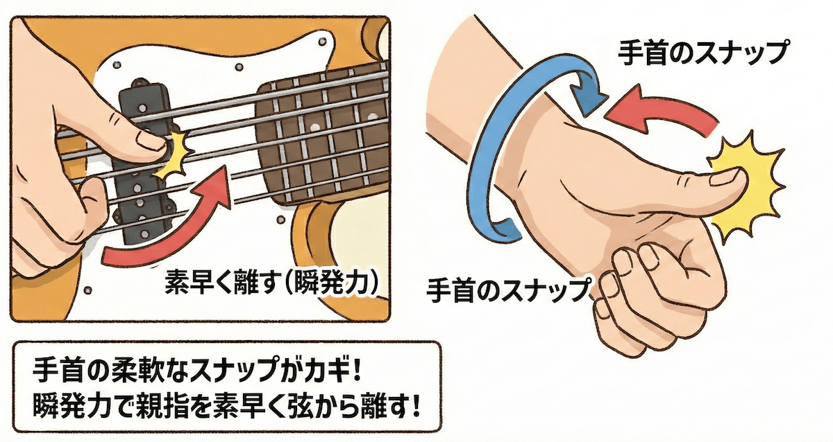 そうすることで、少ない労力で最大限の瞬発力を生み出し、親指を素早く弦から離す動作が可能になります。