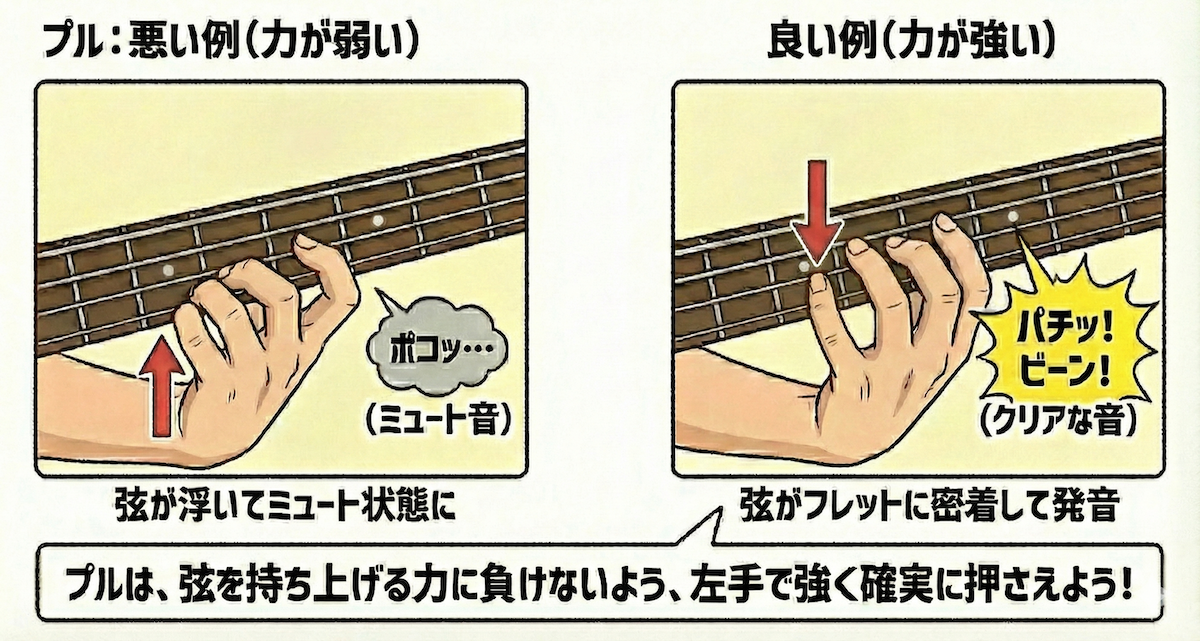 もしプルの初期動作に左手が負けてしまうと、弦がフレットから離れてしまい、“ミュートされた弦を弾いているような状態”になります。その結果、切れの良いアタック音も、音程感のある持続音も鳴らなくなってしまうわけです。