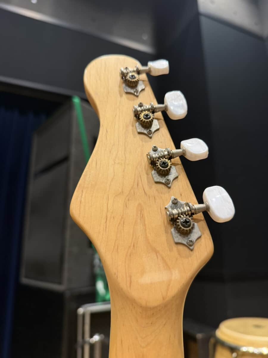 ショート・スケールであることも相まってヘッドも小さくなっているため、ギター用くらいのサイズのペグが付いてます。というよりギター用ですかね……?