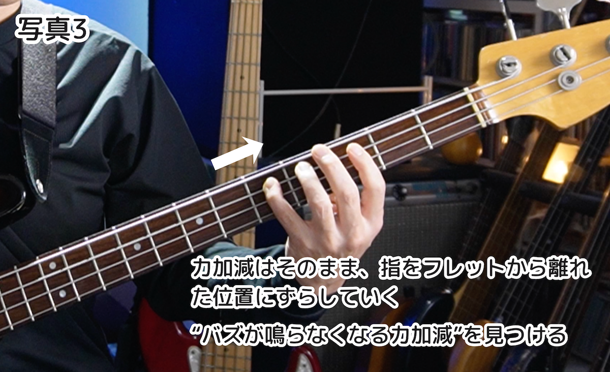 次に、力加減はそのまま、指をフレットから離れた位置にずらしていきます(写真3)。弦がバズり始めたら、少しずつ指の力を入れていき、バズが鳴らなくなる力加減をみつけます。フレットから離れれば離れるほど、より強い力が必要ですよね。