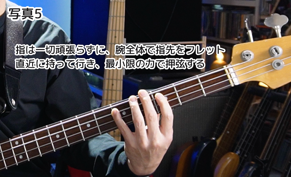 そうではなく、指は一切頑張らずに、それ以外の腕全体(つまり手首、ヒジ、肩、鎖骨の付け根)を適宜動かして、腕全体で指先をフレットの近くまで持って行ってあげるのです(写真5)。ドラマーがスティックの先端をハイハットからスネア、スネアからフロアタムに動かすとき、小手先ではなく腕全体で対処しますよね。それと全く同じです。