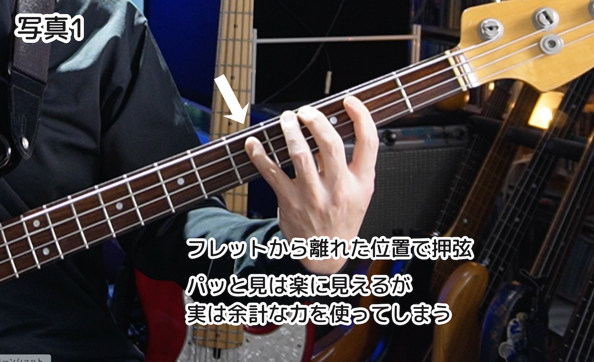 フレットから離れた位置で押弦すると、指も伸ばさなくていいしパッと見はラクなように思えます(写真1)でも、実は余計な力を使ってしまうのです。