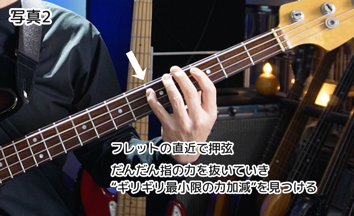 どの弦のどの音でも良いので、フレットの直近で押弦した状態で弦を鳴らしながら、だんだん押弦している指の力を抜いていき、“バズが鳴らないギリギリ必要最小限の力加減”を見つけてください(写真2)。