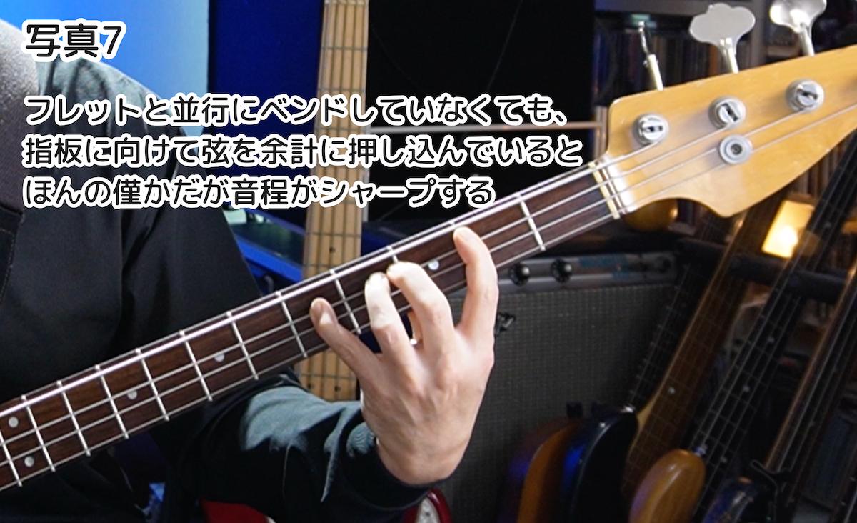 また、フレットと並行にベンドしていないとしても、余計な力で押弦しているということは、指板に向けて弦を押し込んでいることになるので、これも、ほんのわずかですが音程がシャープします(写真7)。