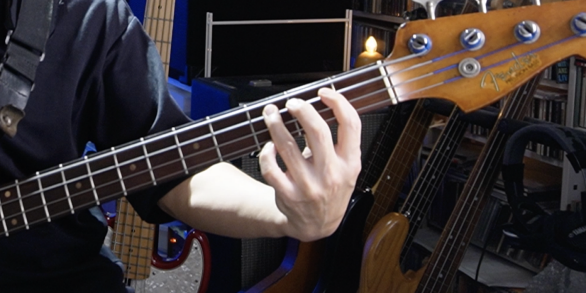 エレクトリック・ベースでは“1フレットにつき指1本を割り当てて同時に4フレットをカバーする押さえ方”を結構使います(写真1)。
