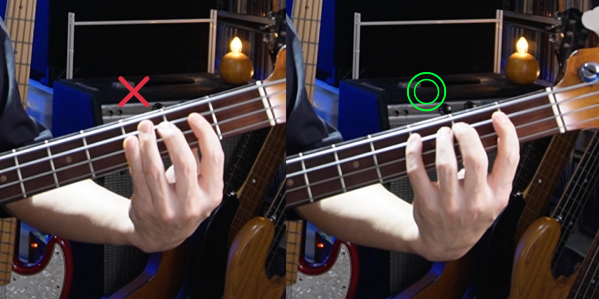 ① “1フレットに指1本”を割り当てて4フレットをカバーして押弦しているが、ロー・ポジションでは指を無理矢理開いて対処してしまい、すぐ疲れてしまう