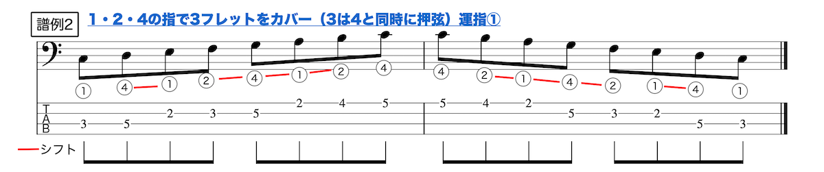 ご覧の通り、4フレット同時にカバーする押さえ方と比べると、当然ながらポジション・シフトは増えます。この点はデメリットですが、どのシフトも1フレット分移動するだけなので、それほど大変ではないでしょう。それよりも、無理して指を開く必要がないし、(4)を(3)がサポートしているので指の疲れや痛みは出にくいはずです。