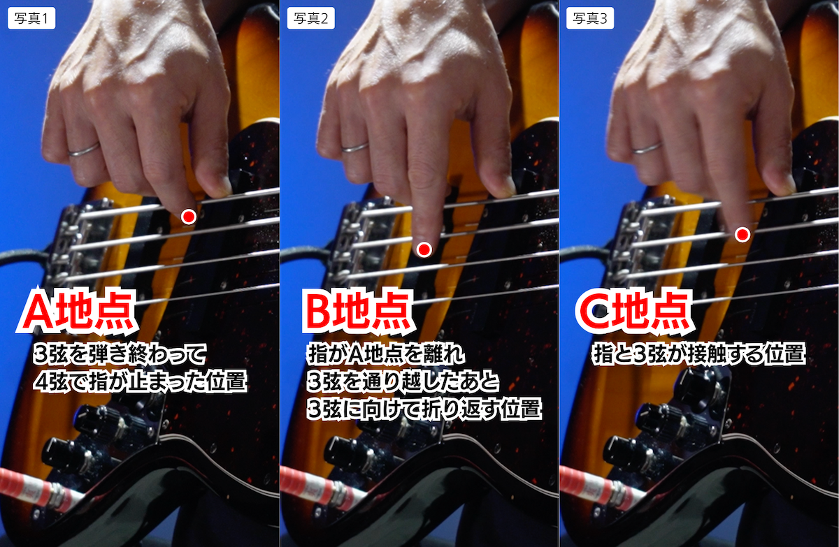 B地点 = 指がA地点を離れ3弦を通り越したあと、3弦に向けて折り返す位置(写真2)