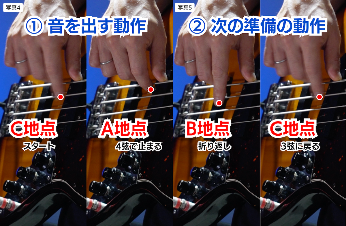 ① 音を出す動作 C地点に置いた指を動かして弦を鳴らし、A地点で止める(写真4)