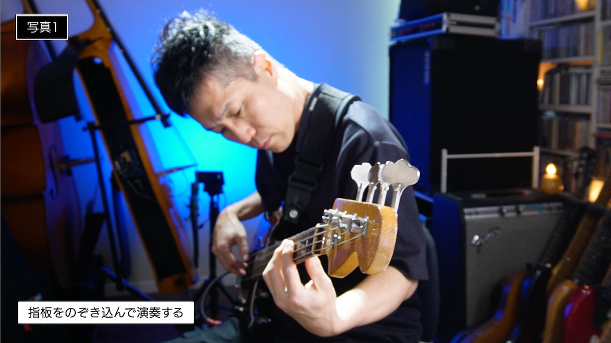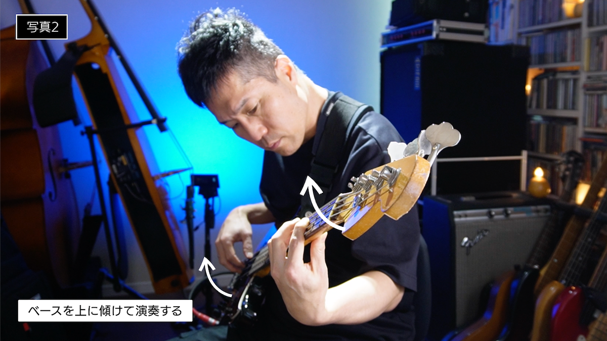 こちらはたまに見かける程度ですが、指板をよく見ようとのぞき込むだけでなく、さらに左手などでベースを少し上向けに傾けて演奏している人もいます。(写真2)