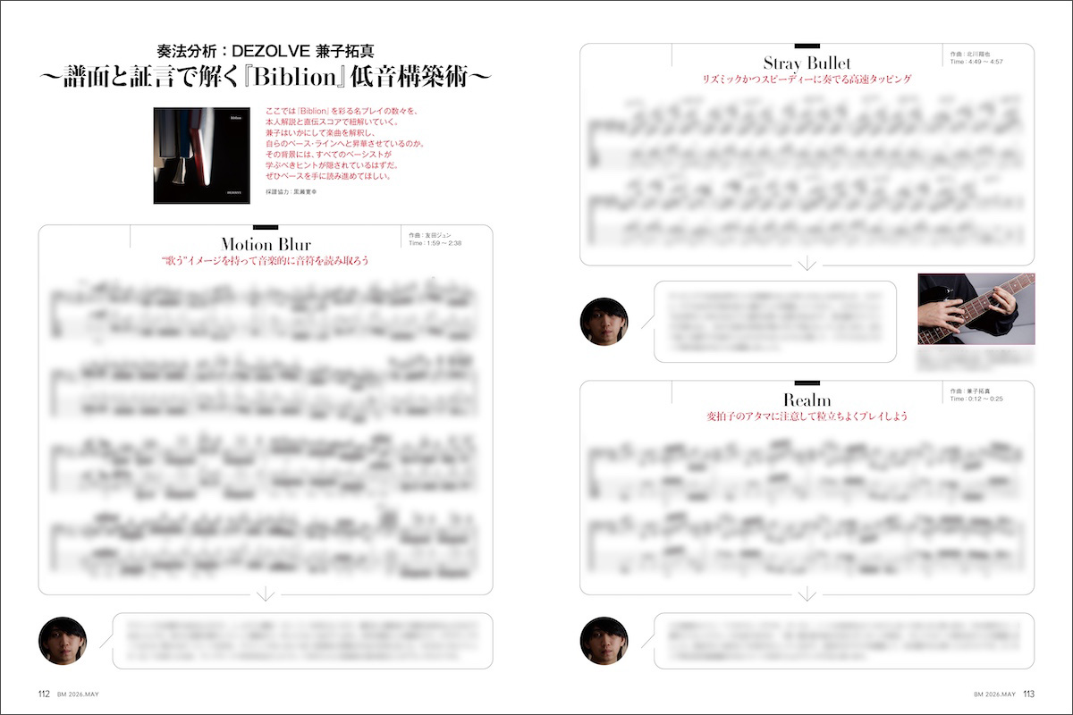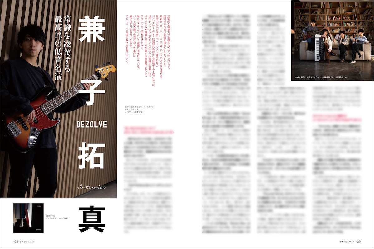 兼子拓真(かねこ・たくま)●1998年生まれ。中学生でベースを始め、高校生のときにYouTubeに投稿した「U Can’t Hold No Groove」(ヴィクター・ウッテン)のカバー動画で注目を集める。現在は、Ado、アイドルマスターシンデレラガールズ、IDOLY PRIDE、DIALOGUE+、東山奈央、柿原徹也、やなぎなぎ、Sou、りぶといったアーティストのサポート・ワークを展開するかたわら、2022年11月に4人組インストゥルメンタル・バンドDEZOLVEへ加入。2026年3月18日に8thアルバム『Biblion』を発表した。