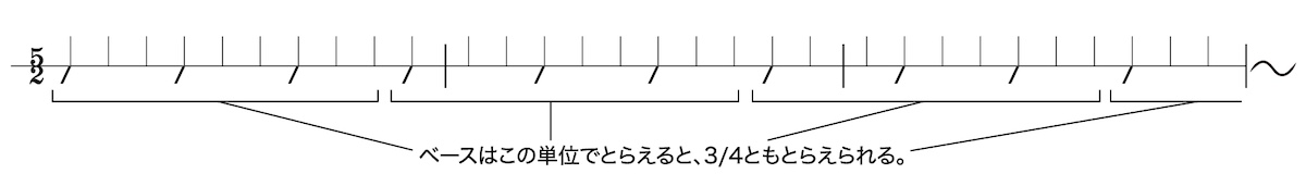 「Soundwalk」は実はごく普通の4/4拍子で、複雑に聴こえる理由はリズムのアレンジにあると思う。バス・ドラムのパターンがちょっと変わっていて奇妙な感じがするだけで、拍子自体は全部4/4なんだ。でも曲によっては変わった拍子のものもある。たとえば「Contour」はすごくナチュラルに感じられるけど、5/4拍子なんだ。でも“1、2、3、4、5”って数えたりはしない。ただ感じているだけ。それは「Somnambulista」でも同じだと思う。これはたしか5/2だったかな? だから“1、(2)、(3)、(4)、(5)”みたいな感じで、ただ感覚的にとらえている。でもこれはライヴでプレイするのがけっこう難しい曲でね。時々ベースが3/4みたいになるんだ。全体のリズムは5拍子なんだけど、ベースは3拍子みたいになる。うまく説明するのが難しいんだけどね。(拍子をとりながら説明してくれる/リズム譜参照)