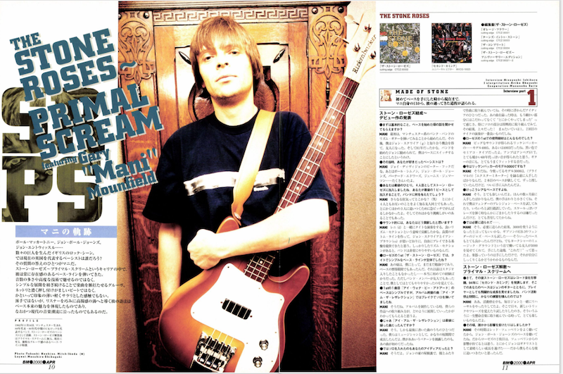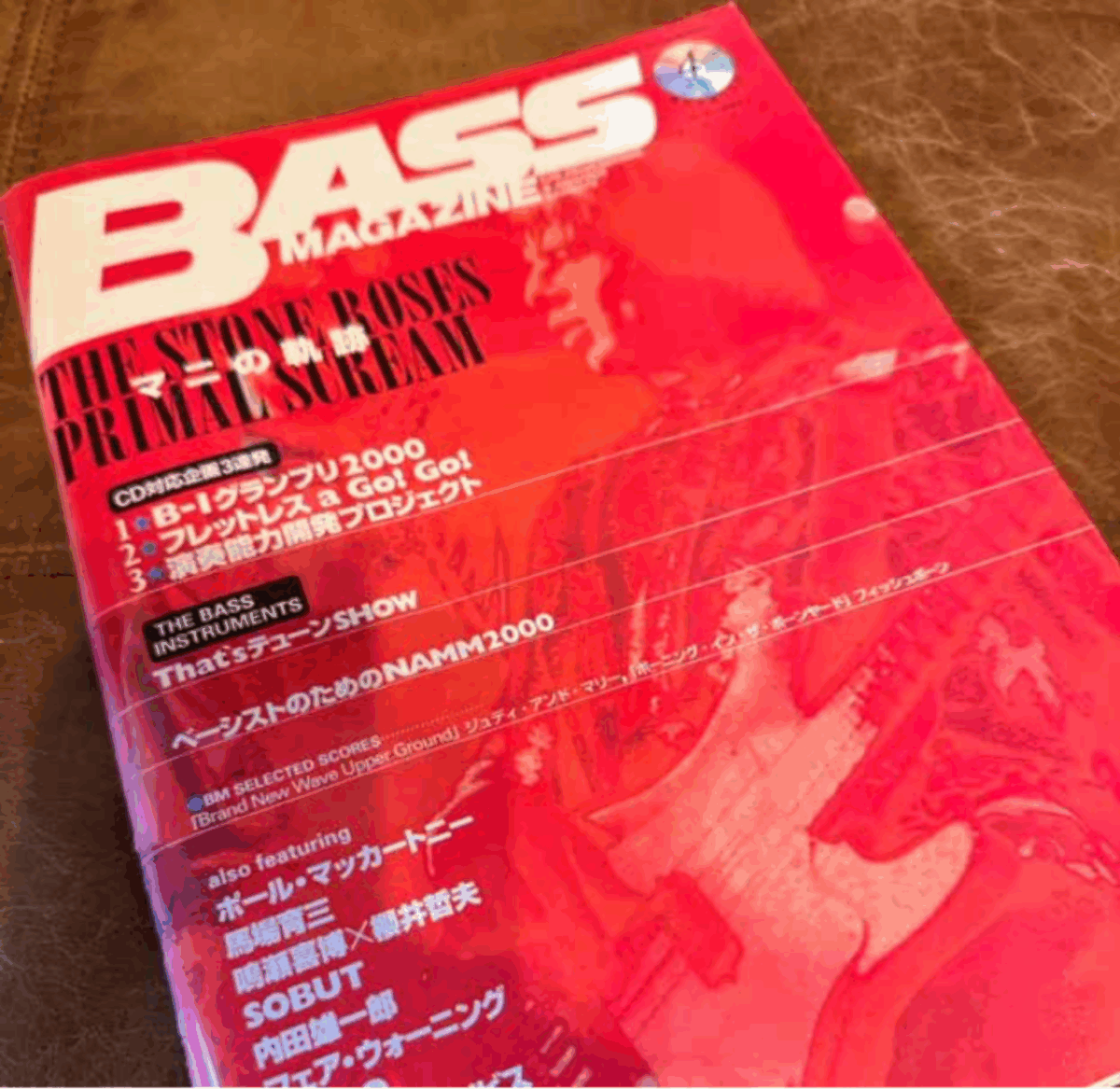 2000 年、プライマル・スクリームで来⽇していたマニに、多忙中の間を縫って取材をレコード会社に懇願し、30 分もない時間ではあったものの、念願のインタビューと表紙特集を『ベース・マガジン』にて実現させることができた。バンドメンバーとしてではなく、ベーシストとしてのプレイやこだわりに迫る、初のインタビューだったと思う。
