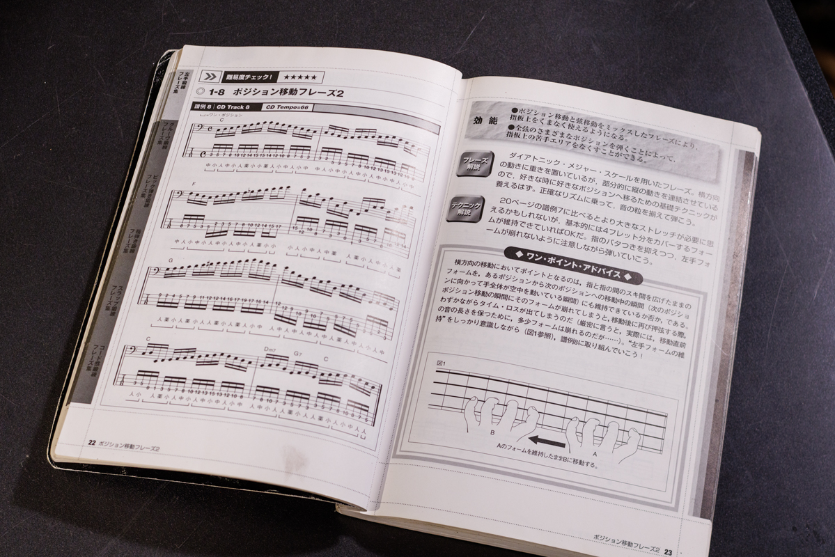僕が高校生の頃にベーマガから発売された教則本『究極のベース練習帳』(2000年刊行)ですね。この本に載っていたフレーズを今でも弾いています。1フレット・1フィンガーで4弦の1f-2f-3f-4f(※ f=フレット)、同じポジジョンで3弦~1弦と上昇したらそのまま下降する。