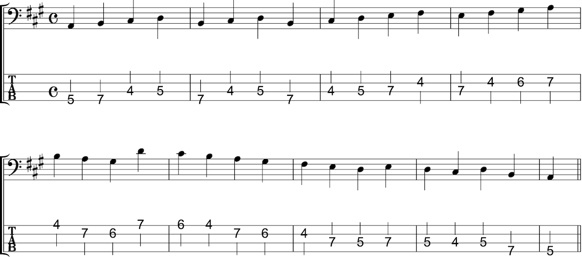 メジャー・スケールで上昇&下降を繰り返す運指練習ですね。これをいろんなキーでやったり、いろんなテンポで弾いたりしていました。
